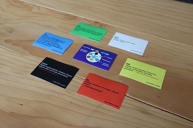 Grundlage für die Übung ist eine für alle Gruppenmitglieder verständliche und klare Entscheidungssituation. Danach werden die Karten des Lernspiels 6-Farben Denken verteilt. Jeder Teilnehmer bringt möglichst akzentuiert Argumente/Aussagen entsprechend der Eigenschaften seiner Karte vor. Nach der Synthese einen Entscheid fällen.