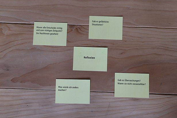 Alle Teilnehmerinnen zeichnen im Tagesrückblick den grafischen Verlauf ihrer Risikowahrnehmung über den Tag auf. Welches waren die gefährlichsten Situationen? Wie sind allfällige Unterschiede in der Wahrnehmung zu erklären? Wie können wir zukünftig Gefahren minimieren?