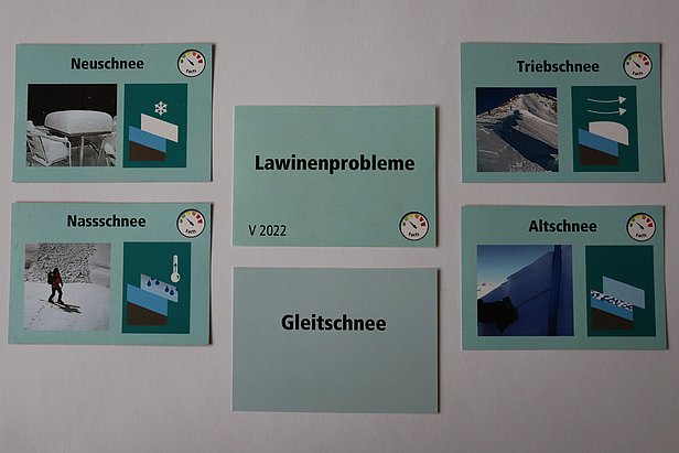 Übung im Plenum. Die Titelkarten der Lawinenprobleme im Raum verteilen. Jede Teilnehmerin bekommt ein Kärtchen aus dem Spiel Lawinenprobleme und muss dieses dem entsprechenden Lawinenproblem zuordnen. Die so entstehenden Gruppen bereiten danach einen Kurzvortrag zum entsprechenden Lawinenproblem vor und halten diesen vor dem Plenum.