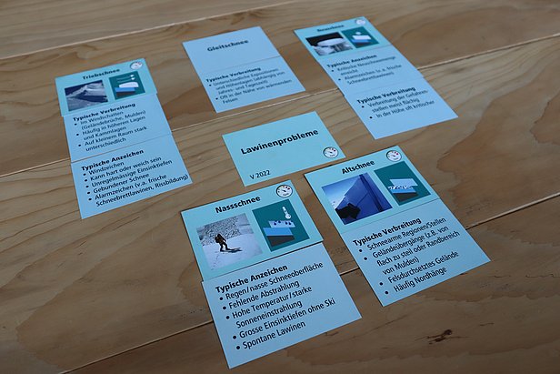 Karten auf Kleingruppen verteilen. Gruppe diskutiert, wie das zugeteilte Lawinenproblem im Gelände erkannt werden könnte und wo es typischerweise vorhanden wäre, und stellt die Ergebnisse im Plenum vor.