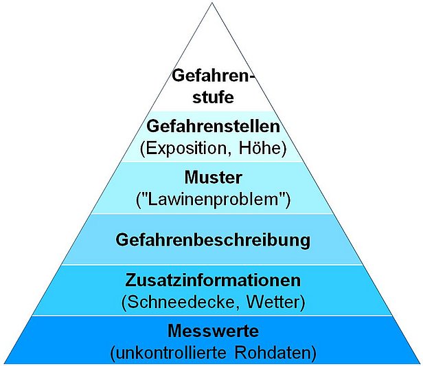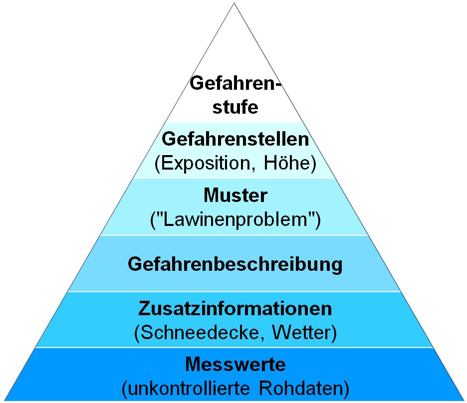Der Inhalt des Lawinenbulletins ist überall gleich strukturiert: Von einfach bis zu komplex bauen die Informationen pyramidenartig aufeinander auf (Gefahrenstufe – besonders betroffenes Gelände – Lawinenproblem – Gefahrenbeschreibung – Schneedecke und Wetter – Daten). Mit zunehmender Informationstiefe steigen die Anforderungen an die lawinentechnischen Kenntnisse der Benutzer.