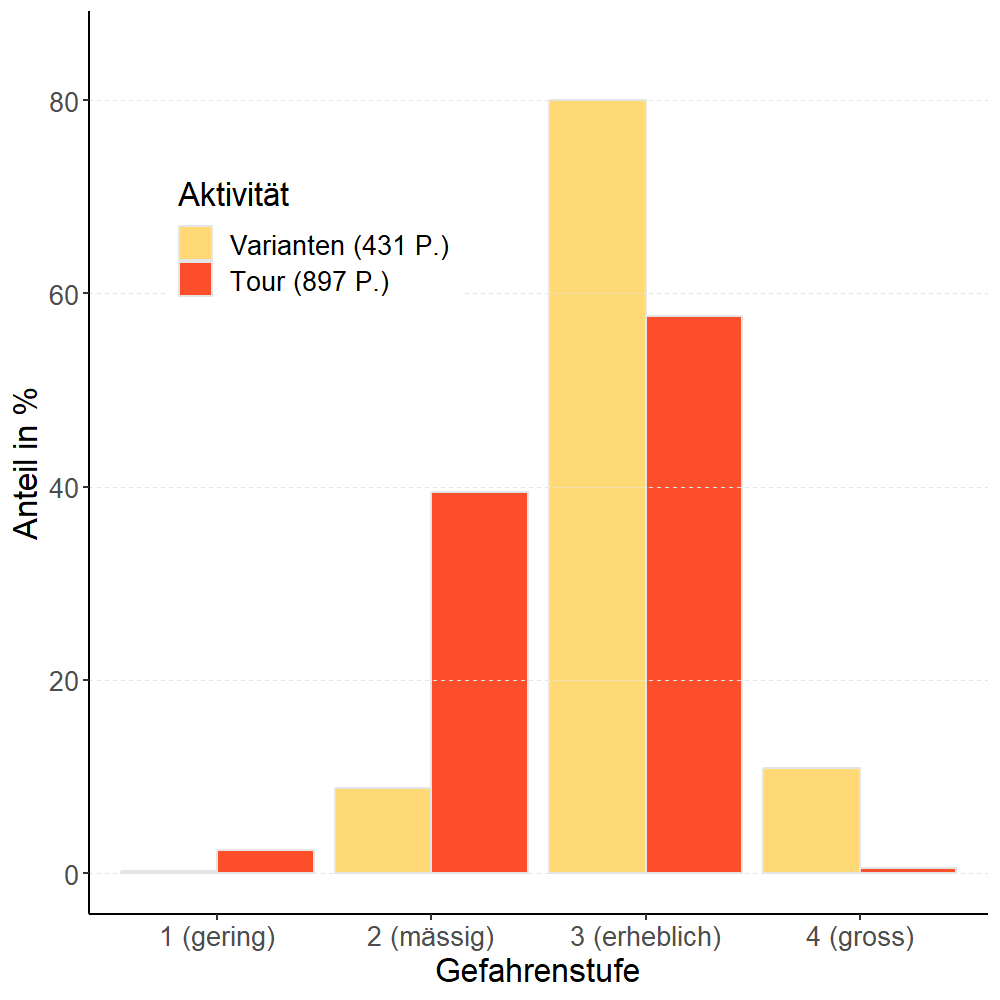 Im langjährigen Durchschnitt sind die meisten Unfälle bei der Gefahrenstufe erheblich, Stufe 3 zu verzeichnen (Abb. 4).