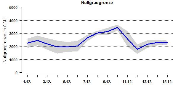 Nach der ausgeprägten Südstaulage Ende November präsentierte sich die erste Monatshälfte Dezember in den Bergen sonnig und zeitweise ausserordentlich mild. So kletterte am Samstag, 10. Dezember auf der 3580 m hoch gelegenen Messstation am Jungfraujoch die Lufttemperatur über die Nullgradmarke und MeteoSchweiz sprach sogar von einer für die Jahreszeit „rekordverdächtig hohen Nullgradgrenze“ (siehe dazu auch Verlauf der Nullgradgrenze in Abb. 2). Abgesehen von vereinzelten Schneeflocken, welche von einer Kaltfront am Sonntag, 11. Dezember gebracht wurden, blieb es überall während dieser zwei Wochen trocken.