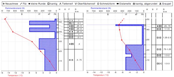 Südhänge waren zwar vielerorts in mittleren und teils auch bis in hohe Lagen schneefrei (Abbildung 6), in schattigen Hängen blieb die dünne Schneedecke aber liegen. Durch die grossen Temperaturunterschiede zwischen dem unter der Schneedecke meist nicht gefrorenen Boden und der sehr kalten Schneeoberfläche (Abbildung 7), wandelte sich die Schneedecke stark um (Abbildung 8). Zudem bildete sich stellenweise grosser Oberflächenreif.