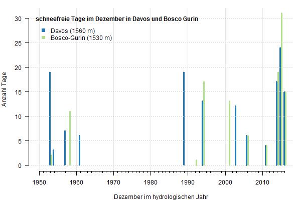 Das Speziellste an der aktuellen Situation ist die Tatsache, dass wir nun unterhalb von 2000 m vielerorts bereits den dritten schneearmen Frühwinter in Folge erleben. Dies zeigt sich zum Beispiel, wenn man die schneefreien Dezember-Tage für jeden Winter an den beiden Stationen Davos und Bosco-Gurin auszählt (Abb. 9). Obwohl der aktuelle Dezember erst zur Hälfte berücksichtigt werden konnte, gehört er bereits heute zu den Frühwintern mit sehr vielen schneefreien Tagen. Die Daten der Station Davos (seit 1892) zeigen, dass der letztjährige Dezember 2015 bei weitem am meisten schneefreie Dezember-Tage aufwies. Als schneefrei bezeichnen wir Tage, an denen auf dem Messfeld kein Schnee lag.