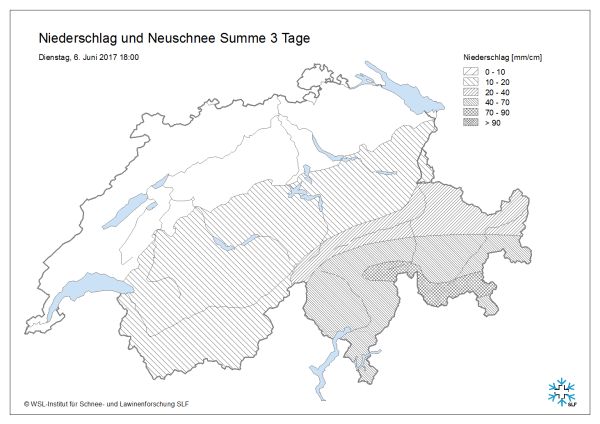 Der Juni startete sonnig. Im Tagesverlauf setzten jeweils Schauer und Gewitter ein. Die Schneefallgrenze lag bei rund 3200 m. In der Nacht auf Sonntag erreichte eine Kaltfront die Schweizer Alpen. In der Folge war es bis zum Dienstag meist stark bewölkt mit schauerartigen Niederschlägen. Die Schneefallgrenze lag zunächst bei rund 3000 m und sank bis zum Niederschlagsende im Norden bis in den Bereich der Waldgrenze, im Süden bis 2700 m. Am meisten Schnee fiel mit 70 bis 90 cm am Alpenhauptkamm vom Rheinwald bis ins Berninagebiet oberhalb von rund 3200 m (Abbildung 3).