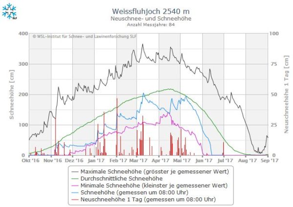 Der zweitwärmste Juni seit Messbeginn hat seine Spuren auch im Gebirge hinterlassen. Die mittleren Juni-Schneehöhen an den IMIS-Stationen waren nur 2011 noch geringer, obwohl die Schneehöhen noch Mitte Mai nur leicht unterdurchschnittlich waren. So verschwand der Schnee im Messfeld Weissfluhjoch (GR, 2540 m) bereits am 14. Juni, was Rang 6 von 81 Jahren und fast einen Monat früher als normal bedeutet (Abbildung 7). Der 14. Juni war zufälligerweise auch das Ausaperungsdatum des bisher heissesten Junis im Jahr 2003. Sehr speziell war die 36 Tage lange, ununterbrochene Schmelzphase vom 9. Mai bis zum Ausaperungsdatum am 14. Juni. In dieser Zeit verschwand eine ursprünglich 194 cm dicke Schneedecke mit einer mittleren Schmelzrate von 5.4 cm pro Tag. Eine noch längere, ununterbrochene Schmelzphase von 37 Tagen bis zum Ausapern ist nur vom Mai/Juni 1964 bekannt. Damals war die Schneedecke nach einem schneearmen Winter am 6. Mai noch 168 cm dick und schmolz anschliessend bis zum 12. Juni mit einer Schmelzrate von 4.5 cm pro Tag vollends weg.
