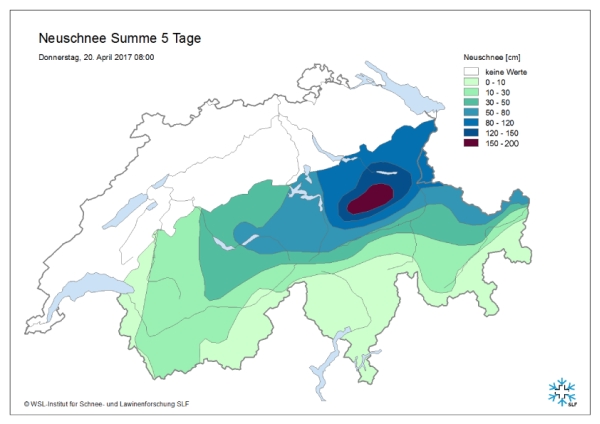 Auf 2000 m lag am Donnerstag, 20.04. in den niederschlagsreichen Gebieten des zentralen und östlichen Alpennordhanges 120 bis 200 cm, gebietsweise bis 300 cm Schnee. Die südlichen Vispertäler und das Oberengadin sowie der Alpensüdhang blieben von den Niederschlägen weitgehend unbeeinflusst und die Schneehöhe auf 2000 m blieb gering (vgl. Abbildung 10)