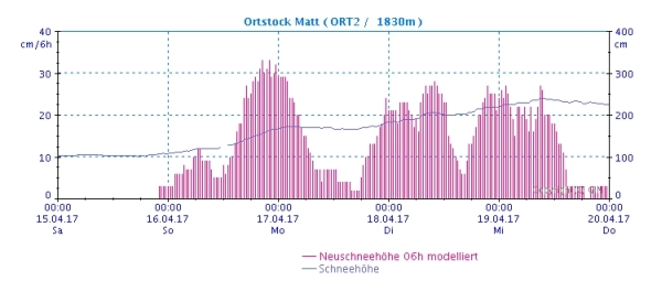 In den Hauptniederschlagsgebieten im Glarnerland wurden zum Teil recht hohe Schneefallintensitäten berechnet, wie zum Beispiel an der IMIS-Station Ortstock/Matt (1830 m) mit bis zu rund 30 cm in 6 Stunden (vgl. Abbildung 4).