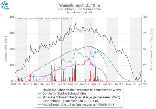 An hochgelegenen Messfeldern (Flachfelder) nahmen die Schneehöhen in der zweiten Maihälfte rasant ab, wie in der Verlaufsgrafik der langjährigen, manuellen Messstation auf dem Weissfluhjoch (Davos, GR, 2540 m) zu sehen ist (blaue Kurve in Abbildung 6).