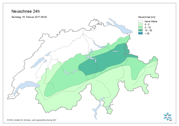 Im Süden blieb es den ganzen Tag recht sonnig. Während es nachmittags im Westen bereits erste Aufhellungen gab, setzte sich der Schneefall im Osten bis in die Nacht auf Samstag fort (vgl. Abbildung 4). Während dem Schneefall blies im Osten ein mässiger West- bis Nordwestwind.