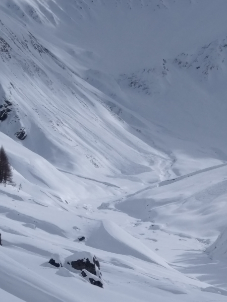 Triebschnee blieb auch im Rest der Berichtsperiode ein Thema (vgl. Abbildung 1 und Bildgalerie). Aus verschiedenen Gründen entstanden aber kaum grössere Triebschneeansammlungen. Zum einen kam mit dem schwachen Niederschlag vom Dienstag nur noch wenig leicht verfrachtbarer Neuschnee dazu. Zum andern blies der Wind während der ganzen Berichtsperiode aus westlichen Richtungen, womit das Angebot an verfrachtbarem Altschnee zunehmend erschöpft war. Zuletzt sind noch die Wärme und der Regen in der zweiten Hälfte der Berichtsperiode zu erwähnen. Diese führten unterhalb von rund 2400 m zu einer Verfestigung der Schneeoberfläche. Dieser feuchte, dichte Schnee wurde kaum mehr vom Wind transportiert. Dadurch beschränkte sich die Triebschneebildung in der zweiten Hälfte dieses Wochenberichts vor allem auf hohe Lagen und aufs Hochgebirge.