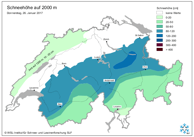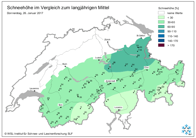 In dieser Wochenberichtsperiode fiel in den Bergen kein Schnee. Auf einer Höhe von 2000 m lag am Donnerstag, 26.01. im Norden verbreitet 1 m, östlich der Reuss bis zu 2 m Schnee. Weiter südlich nahmen die Schneehöhen auf 2000 m markant ab. Für die Jahreszeit waren sie am zentralen und östlichen Alpennordhang leicht unterdurchschnittlich, sonst verbreitet stark unterdurchschnittlich.