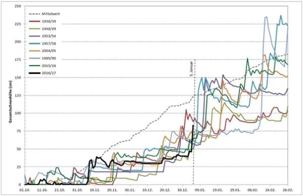 Trotz der lang ersehnten Schneefälle sind die Schneehöhen mit Ausnahme der Stationen unterhalb 1000 m weiterhin stark unterdurchschnittlich, d.h. grösstenteils ist die Schneedecke nur halb so mächtig wie normal um diese Jahreszeit. Noch am Mittwoch, 04.01. verzeichneten 25 von 72 langjährigen Stationen, d.h. 35%, eine rekord-niederige Schneehöhe. Dazu gehört auch die Station Weissfluhjoch (GR, 2540 m), deren Messreihe mehr als 80 Jahre zurückreicht und in den letzten Wochen mehrfach sehr nah an die bisherigen Minima von 1952/53 und 1948/49 herangekommen ist (vgl. Abbildung 9). Am Donnerstag, 05.01. verzeichnen folgende vier langjährigen Stationen immer noch rekord-niederige Schneehöhen: Zermatt VS 1600m (1 cm) , Sass Fee VS 1790 m (0 cm), St. Moritz GR 1850 m (6 cm) und Lauchernalp VS, 1975 m (25 cm).