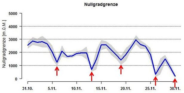 Der Wind blies in dieser Periode am Nördlichen Alpenkamm und am Alpenhauptkamm meist mässig bis stark aus West bis Südwest, sonst schwach bis mässig. Am Mittwoch war es in den Bergen sonnig mit dünnen Wolkenfeldern. Die Nullgradgrenze stieg auf rund 3000 m, im Westen auf rund 3300 m. Damit wurde es, wie schon in den ersten Novembertagen, nochmal sehr mild (vgl. Abbildung 1). Am Donnerstag und Freitag war es im Westen und Süden unterschiedlich bewölkt, im Norden und Osten mit Föhn recht sonnig. Am Freitag nahm auch im Norden die Bewölkung zu.