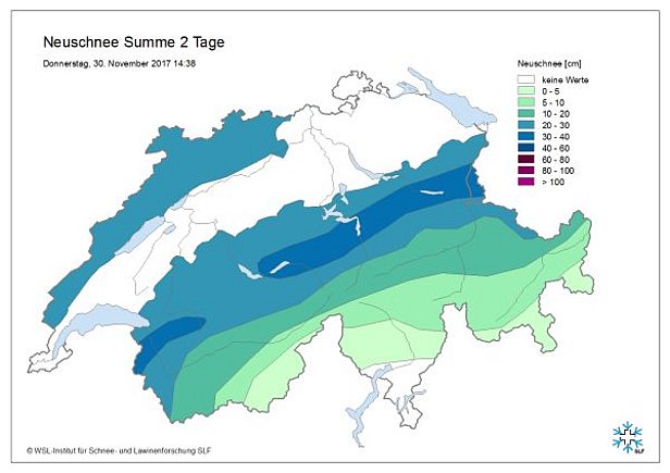 - Alpennordhang vom östlichen Berner Oberland bis in die Glarner Alpen, Alpenhauptkamm vom Simplongebiet bis ins Münstertal und südlich davon, Oberengadin: 30 bis 50 cm, am Alpensüdhang und im Berninagebiet lokal bis 70 cm