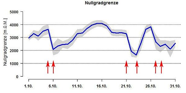 Der Oktober war im Schnitt zu warm, insbesondere zur Monatsmitte mit einem ausgesprochen sonnigen Altweibersommer. Die Nullgradgrenze lag dabei meist im Hochgebirge, was für den Oktober ungewöhnlich hoch ist. Die markantesten Kaltlufteinbrüche gab es am 06.10. und 23.10. (vgl. Abbildung 1).