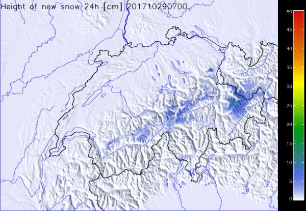 Der Oktober war anfangs wechselhaft. Vom Samstagnachmittag, 30.09. bis am Sonntagmorgen 01.10. fiel im Norden Niederschlag und die Schneefallgrenze sank von 3000 auf rund 2400 m. Dabei fielen im Hochgebirge am Alpennordhang bis 30 cm Neuschnee (vgl. Abbildung 2).