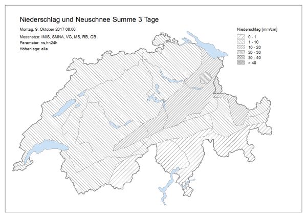 Am Mittwoch, 04.10. und Donnerstag 05.10. war es mehrheitlich sonnig, bevor es am Freitag, 06.10. einen markanten Kaltlufteinbruch mit Niederschlag gab (vgl. Abbildung 4). Die Schneefallgrenze sank dabei auf 2000 m im Westen und 1400 m im Osten. Es wurde also auch in mittleren Lagen weiss. Diese Situation wurde mit zwei Lawinenbulletins am 05. und 06.10. beschrieben. Am Samstag, 07.10. war es mit einem Zwischenhoch sehr sonnig. Am Sonntag, 08.10. war es im Wallis teilweise, im Süden recht sonnig. Sonst war es stark bewölkt mit schwachem Niederschlag. Vom Freitag, 06.10. bis Montag, 09.10. fielen im Norden oberhalb von rund 2300 m 10 bis 30 cm Schnee (vgl. Abbildung 4).