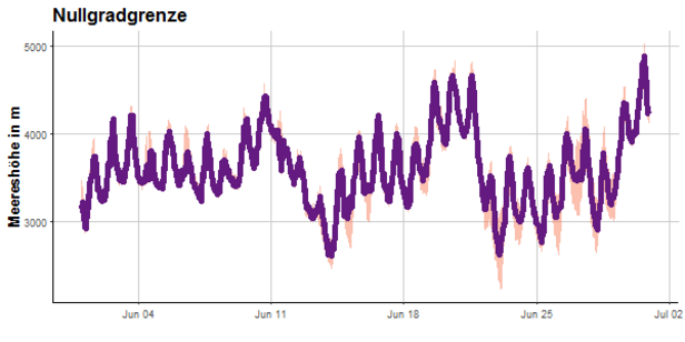 Die Monatsmitte war vom Einfluss des Azorenhochs geprägt und damit meist sonnig. Nur am Sonntag, 17.06. gab es am Alpennordhang einzelne Schauer. Die Temperaturen stiegen wieder an uns so lag die Nullgradgrenze vom Dienstag, 19.06. bis Donnerstag, 21.06. deutlich über 4000 m (vgl. Abbildung 1).