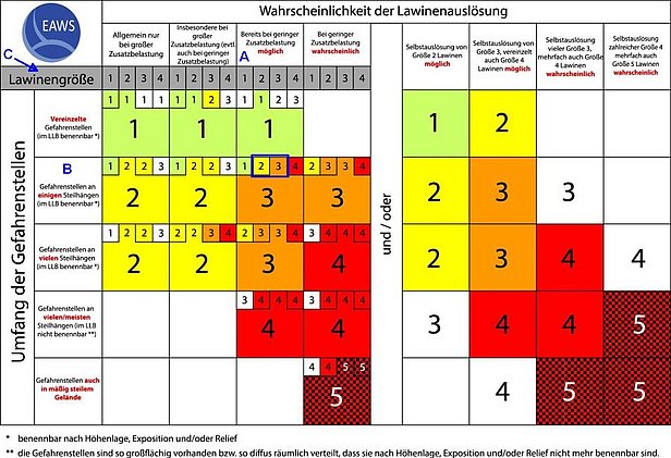 In der untenstehenden Matrix der Europäischen Lawinenwarndienste (EAWS) wurde versucht, die fünf Gefahrenstufen den unterschiedlichen Ausprägungen dieser drei Kriterien zuzuweisen (Abbildung 5). Diese Matrix hat zum Ziel, die Anwendung der Gefahrenstufen zwischen den verschiedenen Warndiensten weiter zu vereinheitlichen.