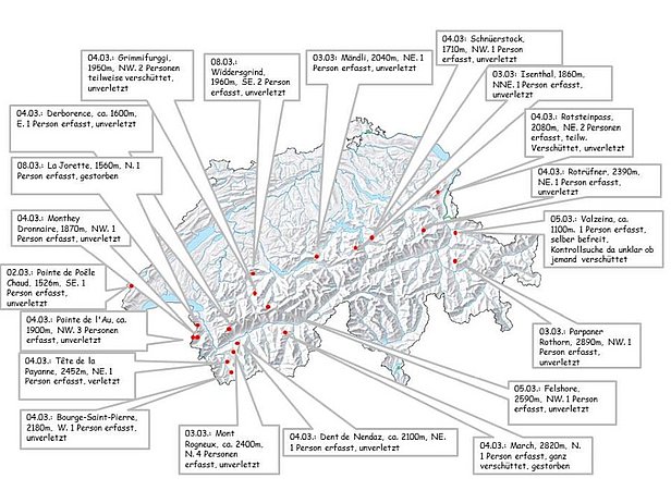Mit Neuschnee und Wind entstanden während dieser Wochenberichtsperiode laufend Triebschneeansammlungen, die aufgrund der ungünstigen Unterlage sehr auslösefreudig waren. Am Wochenende vom 03./04.03. gab es diverse Personenauslösungen und in der Berichtsperiode leider zwei Todesopfer.