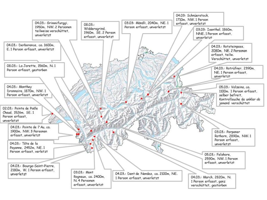 Am Sonntag, 04.03. waren bei sonnigem und mildem Wetter viele Leute in den Bergen unterwegs, entsprechend wurden aufgrund der hohen Auslösebereitschaft auch viele Lawinenauslösungen gemeldet (siehe Kapitel Lawinenunfälle). Die Lawinengefahr wurde verbreitet mit Gefahrenstufe 2 (mässig) eingeschätzt, da die Auslösebereitschaft nicht das einzige Kriterium bei der Festlegung der Gefahrenstufe ist (mehr dazu im folgenden Kapitel „Mässig oder erheblich?“).