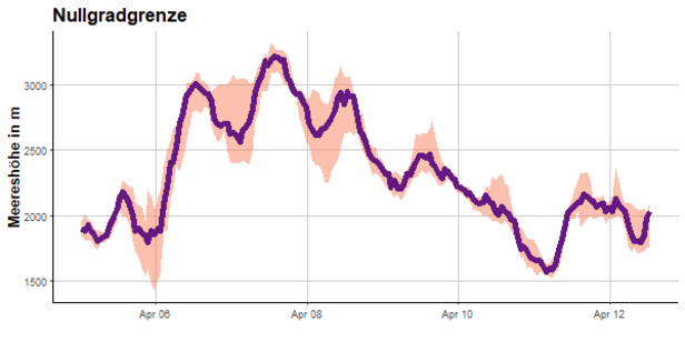 Diese Wochenberichtsperiode war von einer Föhnlage mit all ihren typischen Erscheinungen geprägt: In den nördlichen Alpentälern blies zeitweise starker Föhn (vgl. Abbildung 1) und es war oft föhnig aufgehellt und mild (vgl. Abbildung 2). Zeitweise wurde sogar Saharastaub bis zu den Alpen transportiert. Im Süden war es kühler, meist bedeckt und von Montag, 09.04. bis Donnerstag, 12.04. fiel Schnee oberhalb von rund 2000 m (Vgl. Abbildung 3).