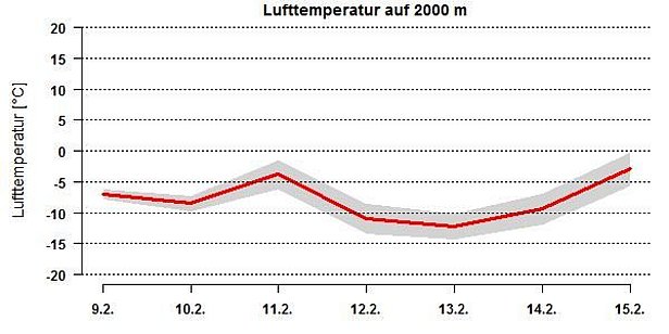 In der Nacht zum Samstag trübte es im Norden ein und es war zunächst stark bewölkt. Verbreitet fiel auch hier ein Schäumchen Schnee. Später trocknete die Luft durch den Einfluss eines Hochdruckkeils von oben ab und die Wolkenobergrenze sank zum Teil unter 3000 m. Auch am Alpensüdhang war es meist sonnig. Der Wind wehte mehrheitlich schwach, besonders am Alpenhauptkamm mässig aus nördlichen Richtungen. Die Mittagstemperatur auf 2000 m lag zwischen -9 °C im Norden und -5 °C im Süden (vgl. Abbildung 1).