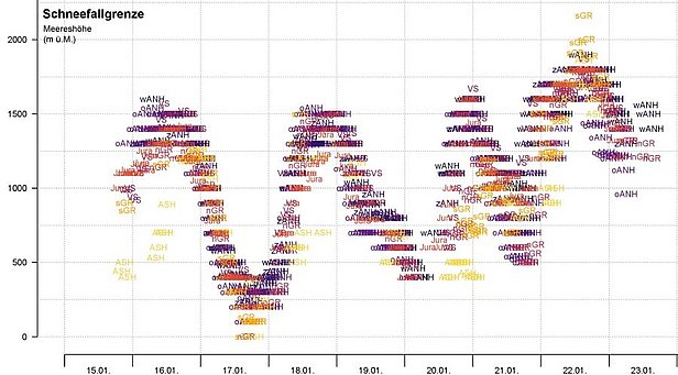 Am Freitag war es bewölkt und die Niederschläge, die seit Montagabend, 15.01. anhielten, liessen etwas nach. Am Samstagmorgen endeten sie im Wallis und im Norden und die Sonne kam kurzzeitig heraus, bevor am Nachmittag von Westen her wieder Schneewolken aufzogen. Im Süden war es meist sonnig, am Samstag zunehmend bewölkt. Der Wind blies im Westen und Norden oft stark bis stürmisch aus West bis Nordwest. Die Schneefallgrenze schwankte zwischen 1000 und 1500 m (Abbildung 1). Im Süden lag sie bei 600 m.