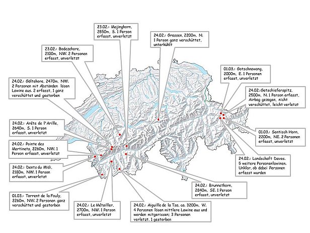 Dem SLF wurden in dieser Berichtsperiode insgesamt 14 Lawinen mit erfassten Personen gemeldet, die meisten aus der Westschweiz (Abb. 6). Leider sind bei drei Lawinenunfällen insgesamt 4 Person gestorben. Damit forderten Lawinen in diesem Winter bereits 15 Todesopfer, was über dem langjährigen Durchschnitt von Anfang März liegt. Die Mehrheit der Opfer waren Tourenfahrer (12), die anderen Freerider.
