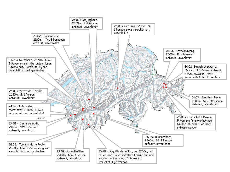Dem SLF wurden in dieser Berichtsperiode insgesamt 14 Lawinen mit erfassten Personen gemeldet, die meisten aus der Westschweiz (Abb. 6). Leider sind bei drei Lawinenunfällen insgesamt 4 Person gestorben. Damit forderten Lawinen in diesem Winter bereits 15 Todesopfer, was über dem langjährigen Durchschnitt von Anfang März liegt. Die Mehrheit der Opfer waren Tourenfahrer (12), die anderen Freerider.
