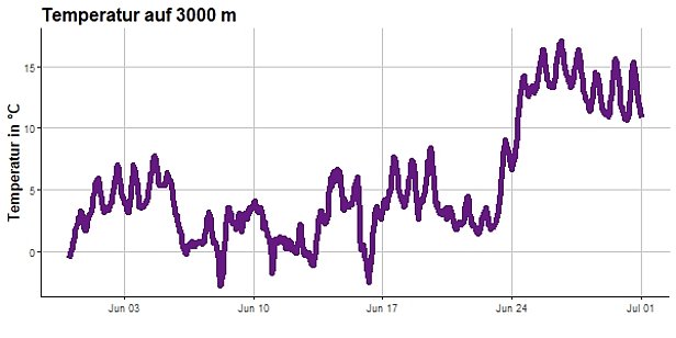 Über Mitteleuropa etablierte sich eine stabile Hochdrucklage. Aus Südwest strömte sehr heisse Saharaluft gegen die Alpen, die zeitweise auch Saharastaub in die Alpen transportierte und auf der Schneedecke ablagerte. Am Freitag und Samstag, 28./29.06. war es im Norden mit schwacher Bise vorübergehend etwas weniger heiss, bevor es am Sonntag, 30.06. noch einmal sehr heiss wurde. In der letzten Juniwoche wurden reihenweise Hitzerekorde geknackt (vgl. Bericht MeteoSchweiz). Am Sonntag, 30.06. wurde in der Schweiz der Spitzenwert der Hitzewelle erreicht. In Sitten stieg die Temperatur auf 37 °C an, was einem neuen Juni-Rekord entspricht. Damit wurden die Höchstwerte vom Donnerstag und Freitag nochmals übertroffen. In Deutschland wurden noch höhere neue Juni-Hitzerekorde (39.6 °C) erreicht, und in Frankreich kam es sogar zu einem neuen Allzeit-Temperaturrekord (45.9 °C).