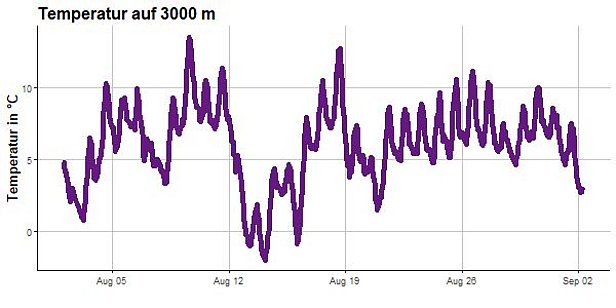 Der August 2019 reihte sich in der Höhe in die wärmsten Augustmonate seit Messbeginn ein. Gemäss dem Klimabulletin von MeteoSchweiz verzeichneten die Messstationen Jungfraujoch und Grosser St. Bernhard mit 1,6 °C resp. 1,9 °C über der Norm den siebt- bzw. fünftwärmsten August seit Messbeginn. Die Tageshöchsttemperaturen auf 3000 m lagen oft zwischen 5 und 10 °C (vgl. Abbildung 1).
