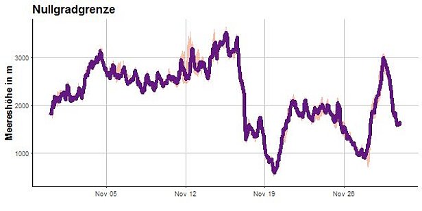 Zum Monatsende wurde es nochmals kurzzeitig sehr mild. Am Donnerstag, 29.11. kletterten die Temperaturen auf 2000 m mit etwas Föhnunterstützung bis +7 °C im Wallis und am Alpennordhang und die Nullgradgrenze stieg auf 3000 m (vgl. Abbildung 1). Bereits am Freitag, 30.11. kühlte es wieder ab.