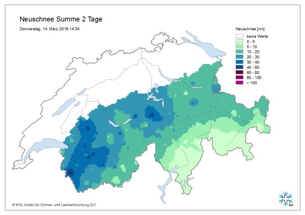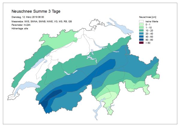 Im Süden war es von Freitag bis Montag recht sonnig, im Norden meist bewölkt. Am Freitag und Samstag fiel noch kein nennenswerter Niederschlag. Die Schneefallgrenze lag auf 1300 m und stieg am Samstag im Westen auf rund 2200 m, sonst auf rund 1800 m. Ab Samstagabend verstärkte sich der Niederschlag. Erst am Sonntagabend sank die Schneefallgrenze von rund 2000 m rasch in tiefe Lagen. Am Montag gab es verbreitet Schneefall bis in tiefe Lagen. Dieser endete in der Nacht auf Dienstag, 12.03. In Summe fielen vor allem im westlichen Unterwallis und am nördlichen Alpenkamm beträchtliche Schneemengen (vgl. Abb. 1).
