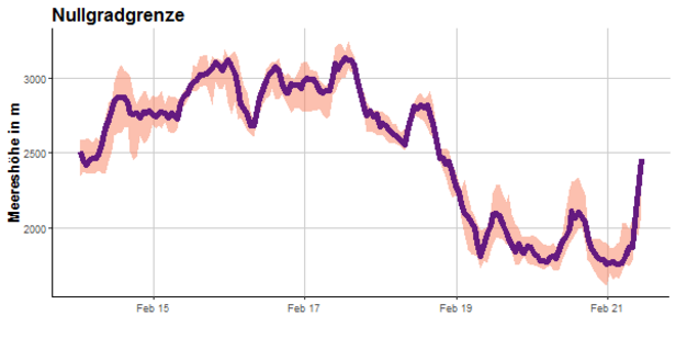 Eine stabile Hochdrucklage bescherte uns eine ausgesprochen sonnige und milde Berichtsperiode. Die Nullgradgrenze lag von Freitag, 15.02. bis Montag, 18.02. oberhalb von 2500 m. Zeitweise wurde sogar die 3000 m Marke überschritten (Abb. 1). Gegen Ende der Berichtsperiode sank die Nullgradgrenze zeitweise wieder leicht unter 2000 m, die Temperaturen blieben aber weiterhin aussergewöhnlich hoch.
