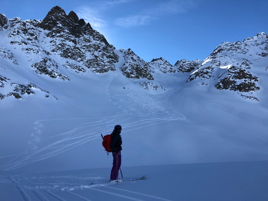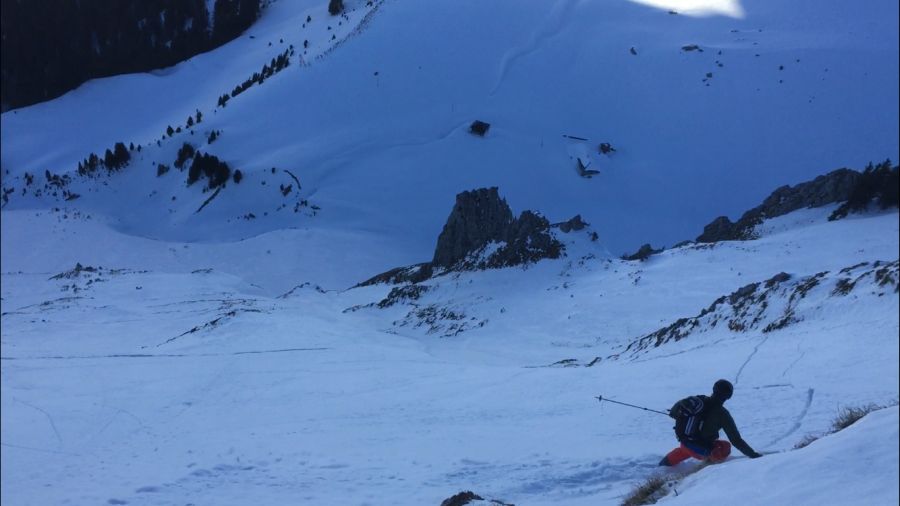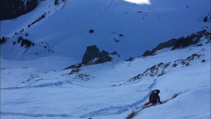 Aufgrund der mit der Jahreszeit intensiver werdenden Sonneneinstrahlung und der hohen Temperaturen bildete sich an Sonnenhängen eine Schmelzkruste. Diese war an steilen Südhängen teils bereits tragfähig und ermöglichte Abfahrten in schönsten Frühlingsverhältnissen, wie zum Beispiel am Stoss (SG) (Abb. 3).