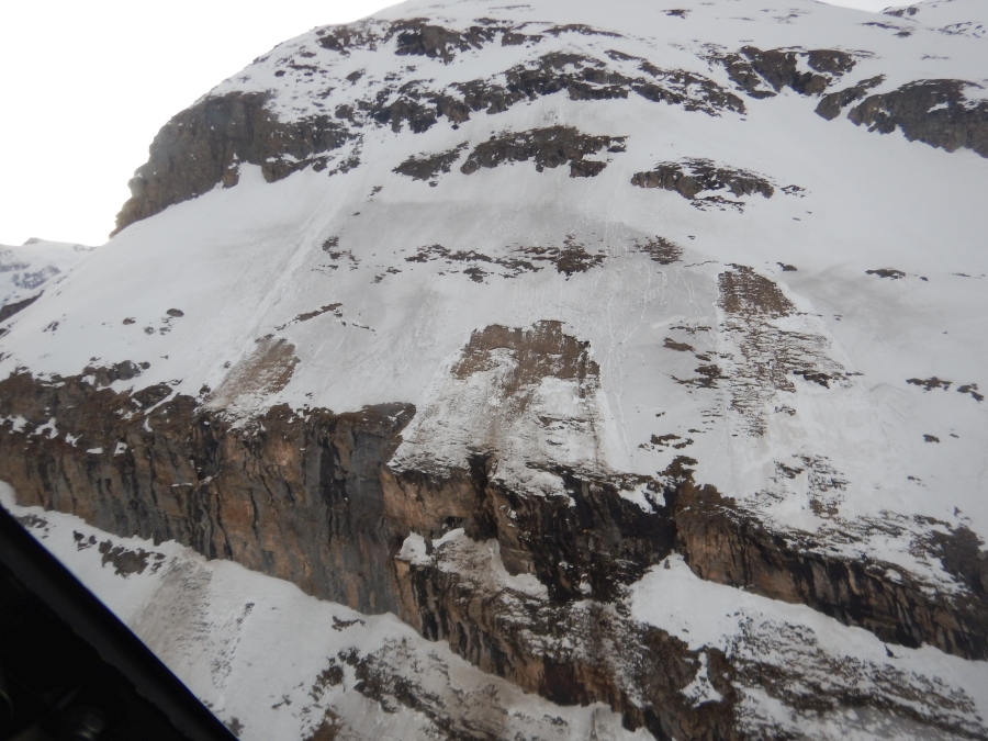 So klein wie die Lawine am Gfrorenhorn blieben die Lawinen jedoch keineswegs immer. Viel Glück hatte ein Tourengeher im Simmental, der im extrem steilen Gelände eine Schneebrettlawine im Altschnee auslöste (Abb. 7-1 bis 7-5) und nicht mitgerissen wurde. Gemäss der betroffenen Person wurden im Gebiet viel sehr steiles Gelände folgenlos befahren. Dies zeigt eindrücklich, dass viele Spuren im Gebiet keine absolute Sicherheit geben und Gefahrenstellen sehr lokal, aber nicht minder gefährlich sein können.
