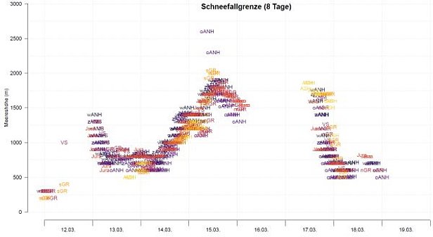 Mit einer starken Nordwestströmung hielten die Niederschläge, die am Dienstagabend, 12. März einsetzten, bis in die Nacht auf Samstag an und waren am Freitag, 15. März besonders intensiv (Abbildung 1). Während es in der vorigen Berichtswoche noch in bis in tiefe Lagen schneite, stieg die Schneefallgrenze im Verlauf des Freitags bis auf rund 2000 m an (Abbildung 2).