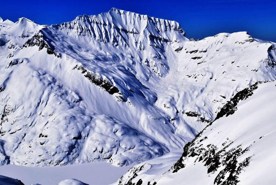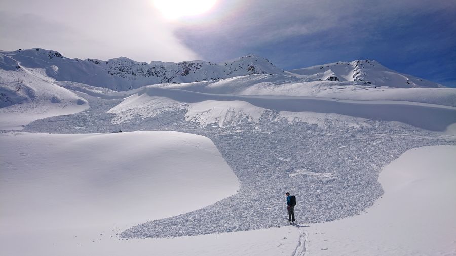 Um Mitternacht von Montag, 18.03. auf Dienstag, 19.03.2019 ereignete sich ein grosser Felssturz an der Nordwestflanke des Flüela Wisshorns (GR, 3085 m). Er löste eine sehr grosse Lawine aus, die bis auf rund 2200 m vorstiess (Abbildung 9). Der Felssturz wurde vom Schweizerischen Erdbebendienst erfasst (vgl. Bildgalerie). Da weitere Felsstürze möglich sind sollte dieser Bereich gemieden werden.
