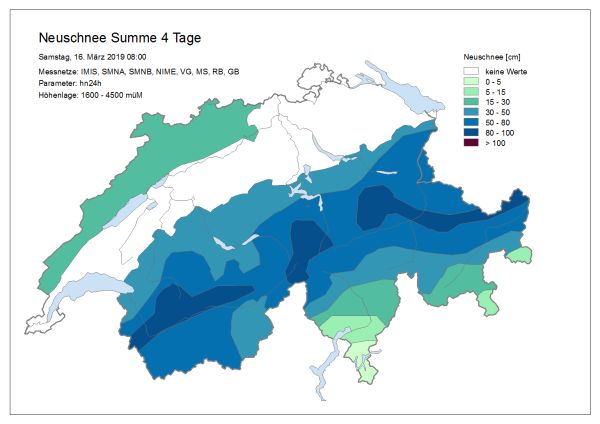 Insgesamt fielen vom Dienstagabend, 12. bis Samstagmorgen, 16. März im Norden oberhalb von rund 2000 m 50 bis 80 cm Schnee, gebietsweise bis 110 cm. Gegen Süden nahmen die Neuschneemengen ab. Aufgrund des schauerartigen Charakters der Schneefälle und des stürmischen Windes waren regionale Unterschiede der Neuschneemengen besonders ausgeprägt (Abbildung 3).