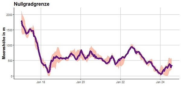 Die Nullgradgrenze (Abbildung 1) lag durchgehend in tiefen Lagen, das heisst unterhalb von 1000 m. Im Flachland wurden zum Teil Eistage, also Tage an denen die Lufttemperatur immer unter 0 °C lag, verzeichnet.