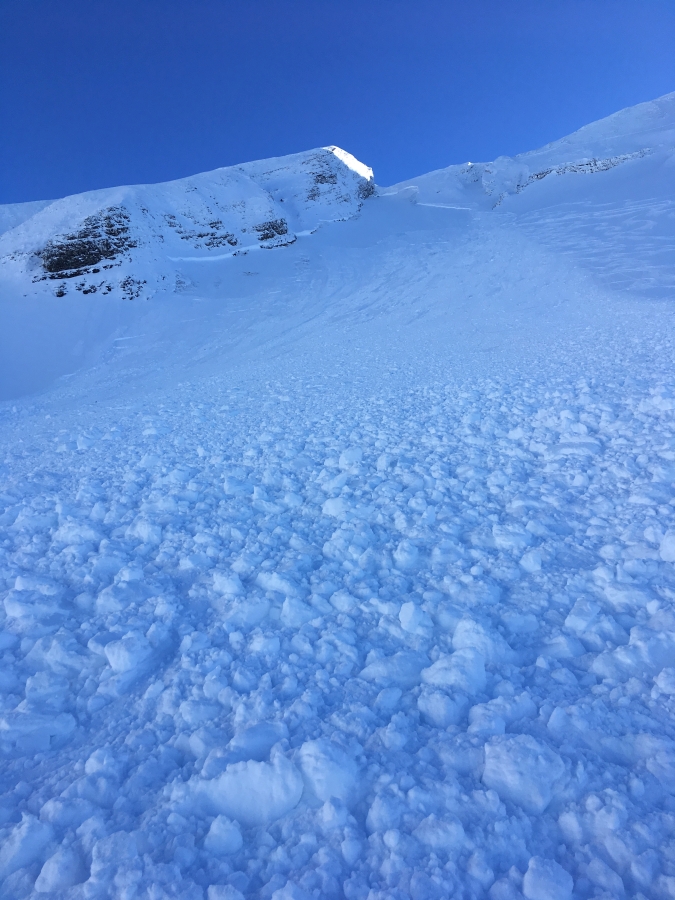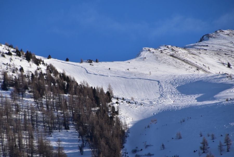 Vor allem am Anfang der Periode wurden verbreitet Gleitschneelawinen beobachtet. Hauptsächlich in den schneereichen Gebieten im Norden und Osten waren diese teils gefährlich gross und konnten exponierte Verkehrswege gefährden. Die Aktivität von Gleitschneelawinen nahm im Verlauf der Woche wieder ab. Gleitschneerisse wurden an Südhängen teilweise bis in Höhenlagen von 2500 m beobachtet. So zum Beispiel im Val d’Urezza (GR): hier wurden eine Gleitschneelawine und Gleitschneerisse, sogenannte Fischmäuler, an einem Südosthang auf 2400 m fotografiert (Abbildung 6).