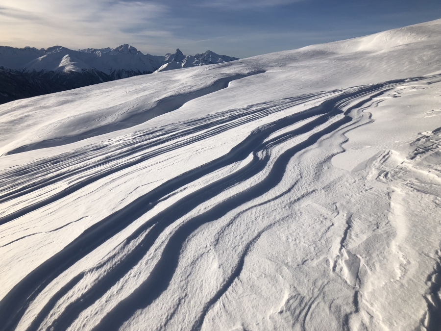 - Oberflächennahe Schneeschichten waren entweder vom Wind geprägt und der Triebschnee leicht auslösbar (vgl. Wochenbericht 14.-20. Dezember) oder aber aufbauend umgewandelt und locker. Damit waren sie durch den starken Wind verfrachtbar und gleichzeitig eine schwache Grundlage für abgelagerten Neu- und Triebschnee.