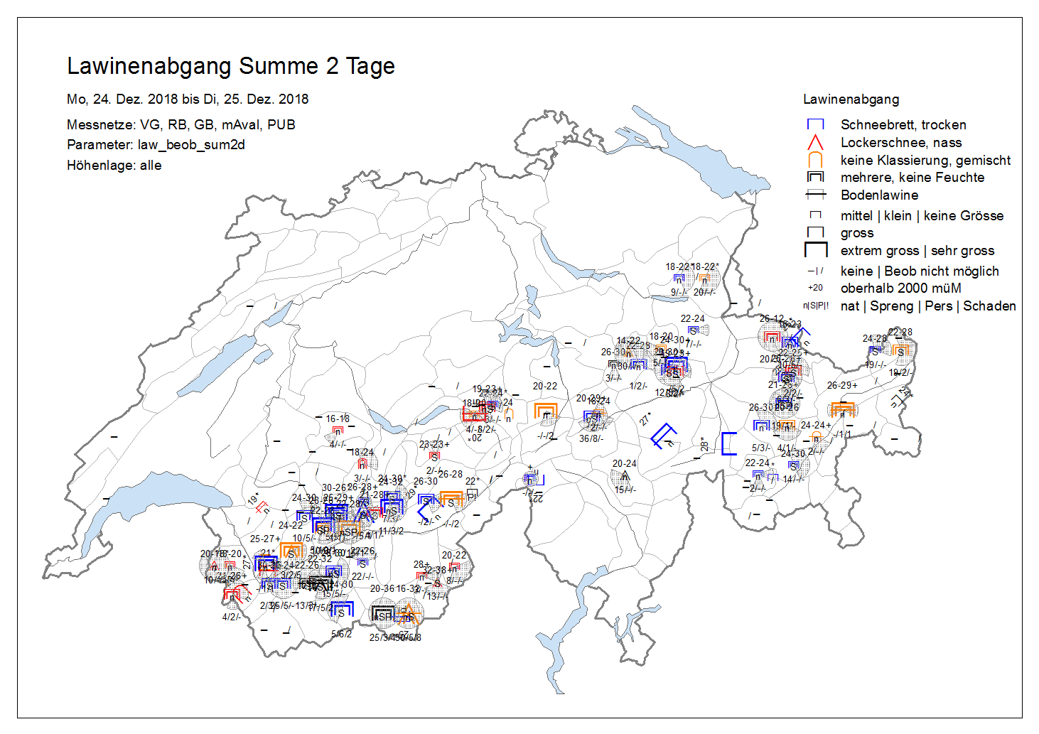 Die Niederschläge setzten um den Sonntagmittag im Norden ein. In der Nacht fiel intensiver und ergiebiger Niederschlag. Am Nachmittag des Heiligabends endeten die Niederschläge rasch von Ost nach West und in der Höhe wurde es zum Teil sonnig. Die Schneefallgrenze stieg am Sonntagnachmittag rasch auf 2200 bis 2400 m und sank erst gegen das Ende der Niederschläge wieder auf etwa 1300 m ab. Auf 2500 m fielen in rund 24 Stunden die in Abbildung 2 dargestellten Neuschneemengen. In den Glarner, St. Galler und Liechtensteiner Alpen fielen 60 bis 80 cm, sonst am Nördlichen Alpenkamm, im Wallis, in Nordbünden, den nördlichen Teilen Mittelbündens und im Unterengadin 40 bis 60 cm, weiter südlich weniger. In noch höheren Lagen waren die Neuschneemengen noch etwas grösser. Unterhalb von 2000 m fielen zum Niederschlagsende mit absinkender Schneefallgrenze rund 20 cm Schnee im Norden und rund 30 cm im Gotthardgebiet und in Teilen Graubündens.