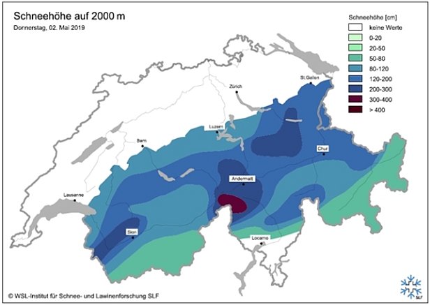 Oberhalb von 2000 m lag in allen Gebieten noch mehr Schnee als sonst um diese Jahreszeit üblich. Vom Oberwalliser bis zum Engadiner Alpenhauptkamm lag 1.5 bis 3 Mal so viel, sonst verbreitet 1.4 bis 1.7 Mal so viel Schnee. Am westlichen Alpennordhang, im Unterwallis, am östlichen Alpennordhang und in Nordbünden war dies mit 1.1 bis 1.4 Mal so viel Schnee weniger ausgeprägt. Auf 2000 m lagen die in Abbildung 8 dargestellten Schneehöhen. Dabei ist zu beachten, dass sich diese Werte auf eher windgeschützte Flachfelder beziehen.