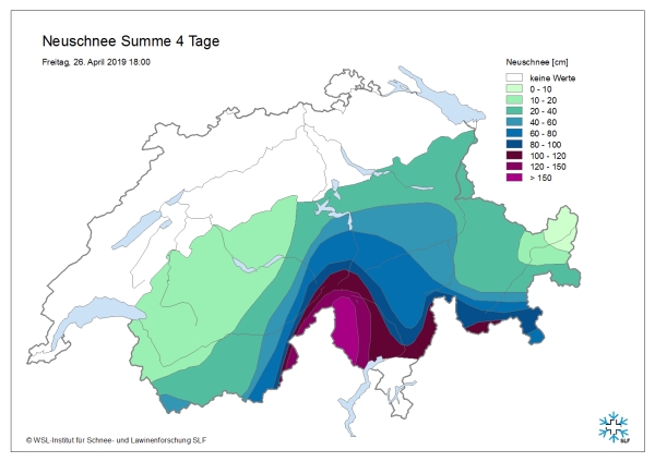 Ein erneuter Grossschneefall im Süden und auch beachtliche Schneemengen im Norden führten zuerst zu einer kritischen Lawinensituation. In hohen Lagen und im Hochgebirge waren die Verhältnisse winterlich. Die Nullgradgrenze lag am Sonntag, 28.04. um 1000 m (Abbildung 4). Die Gefahr von Nassschneelawinen trat mit der deutlichen Abkühlung in den Hintergrund. Zum Ende der Berichtsperiode nahm die Lawinengefahr ab. Am Mittwoch, 01.05. herrschte Kaiserwetter und eine mehrheitlich günstige Lawinensituation.