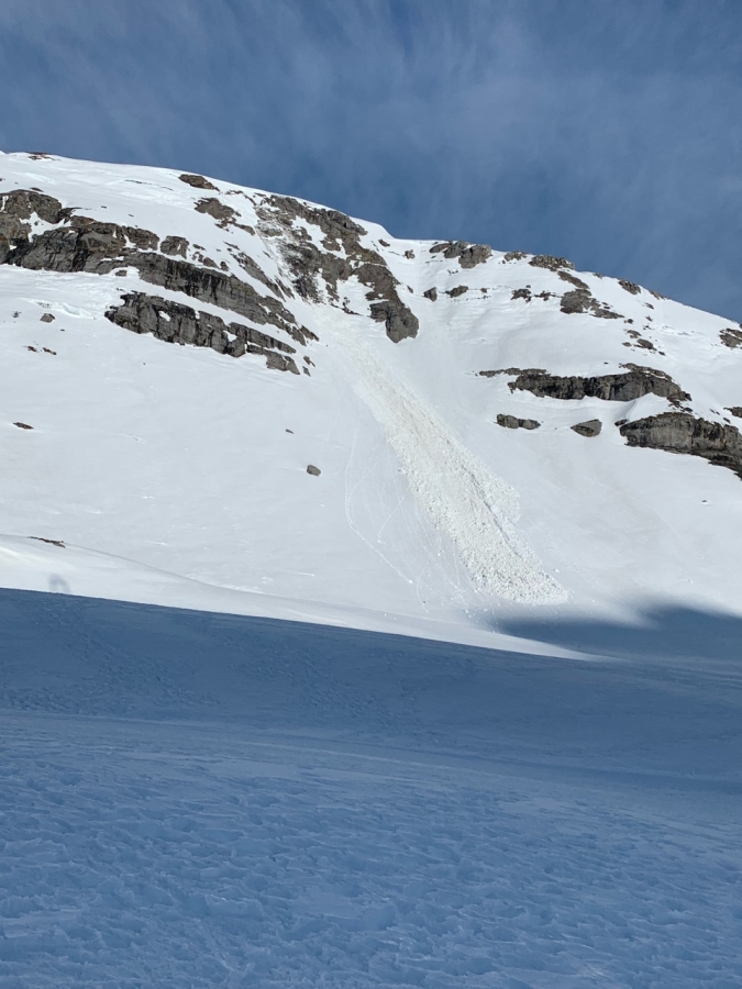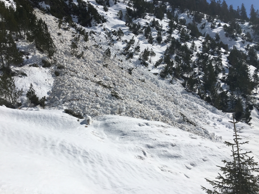 Die Gefahr für Nass- und Gleitschneelawinen stieg jeweils im Tagesverlauf an, verbreitet auf Stufe 2. An sehr steilen Hängen sulzte die Schneeoberfläche auf, jeweils zunächst am Vormittag an den Ost- und Südhängen, dann im weiteren Tagesverlauf auch an Westhängen. Es gingen einige, meist kleine bis mittlere Nass- und Gleitschneelawinen nieder. Sehr vereinzelt wurden grosse Gleitschneelawinen beobachtet (Abbildung 2).