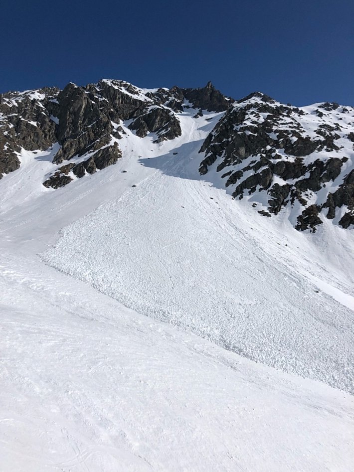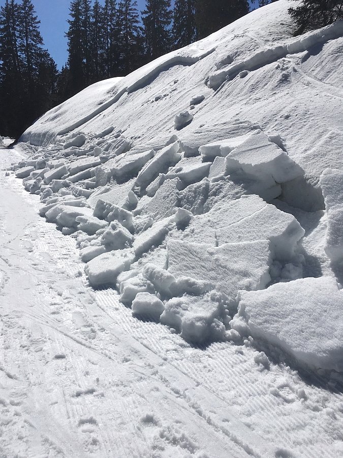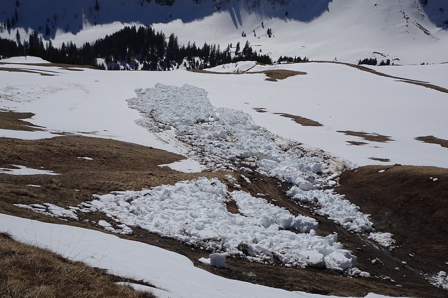 Die Gefahr für Nass- und Gleitschneelawinen stieg jeweils im Tagesverlauf an, verbreitet auf Stufe 2. An sehr steilen Hängen sulzte die Schneeoberfläche auf, jeweils zunächst am Vormittag an den Ost- und Südhängen, dann im weiteren Tagesverlauf auch an Westhängen. Es gingen einige, meist kleine bis mittlere Nass- und Gleitschneelawinen nieder. Sehr vereinzelt wurden grosse Gleitschneelawinen beobachtet (Abbildung 2).